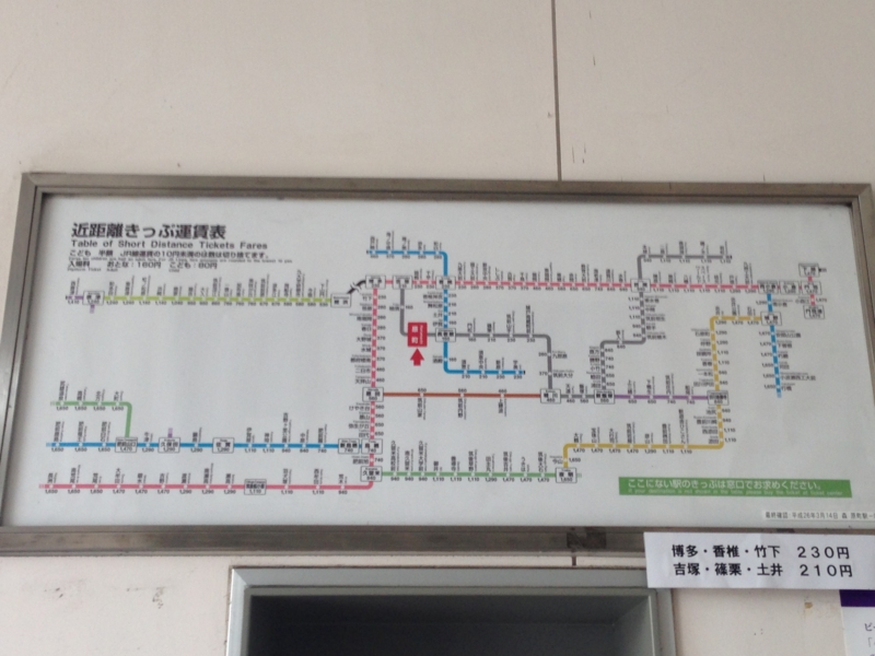 原町駅の運賃表です。博多駅からの運賃は230円、小倉駅からの運賃は1290円です。